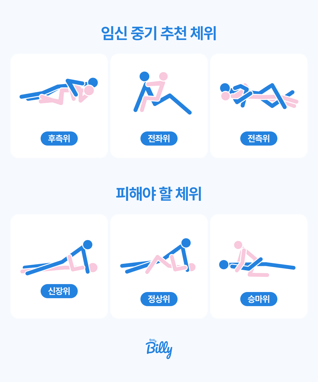 부부 관계💏를 돈독하게 해주는 임신 중 성관계! 안전하게 한다면 더욱 좋겠지요. 우선 엄마의 배를 압박하는 자세는 하지 않도록 해요. 그리고 엄마가 많이 움직일수록 자궁에 자극이 갈 수 있고 이는 조기 진통을 유발할 수 있어요. 그러므로 엄마가 최대한 편한 자세가 될 수 있도록 부부가 의논하도록 합니다.