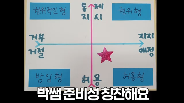 적절하게 허용해줄 것은 충분히 허용해주면서 지시는 덜 하고 애정과 지지는 충분하게 표현해주시는 게 가장 민주적이고 협조적이고 이상적인 유형이에요.💗