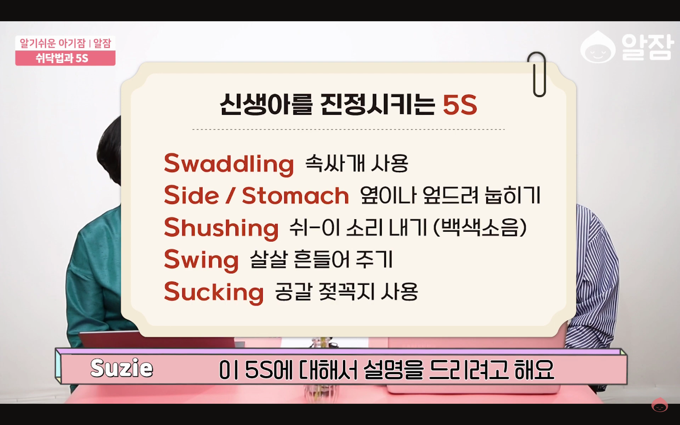 아이를 진정시킬 수 있는 방법은 '5S'만 기억해 주시면 돼요❗ 이 방법도 3개월 이하의 아이들에게 잘 통하는 방법이에요. 욕구와 반응을 이용해서 아이를 달래는 방법이랍니다. 첫 번째는 쉬닥법과 아닥법으로 설명드린 'Shushing' 방법이에요. 태아가 양수 안에 있을 때의 소리가 백색 소음과 비슷하다고 해요😉. 그래서 쉬~(또는 아~)와 같은 백색소음으로 아이를 재울 수 있어요. 아이가 잠들기 전에는 약 50db의 생활 소음 정도로, 잠든 후에는 아이의 귀에서 멀어지며 소리를 점점 줄여 나가 주시면 돼요. 나머지 방법은 아래에서 하나씩 설명해 드릴게요!