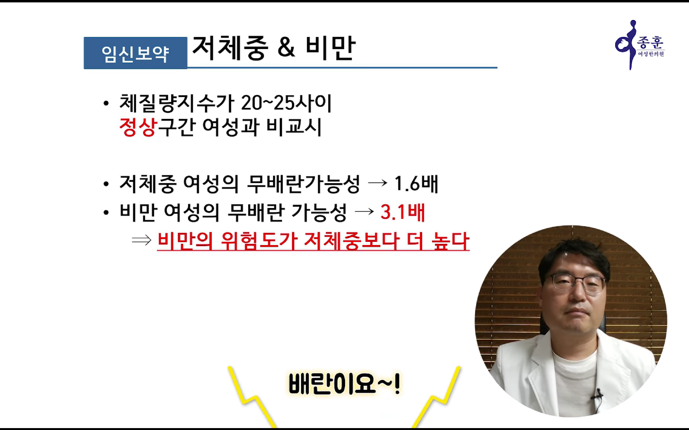 임신을 위해서는 기본적으로 배란💞이 잘 되어야 해요. 그러나 체질량지수가 정상 구간인 다른 분들과 비교해 보면 저체중의 경우에는 몸 안의 에너지 부족📉으로 인해서 무배란의 가능성이 1.6배 높아요. 그리고 과체중인 경우에는 배란될 수 있는 에너지는 있으나 배란을 방해💔하는 원인이 있어요. 다낭성난소증후군, 인슐린 저항성 증가, 남성호르몬 과다 등의 원인으로 인해서 무배란 가능성이 무려 3.1배나 높다고 해요.
