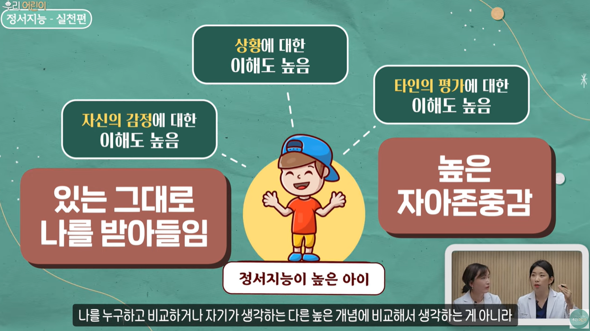 정서지능이 높은 아이는 자신의 감정, 상황, 타인의 평가에 대한 이해도 높아요! 그래서 있는 그대로 나를 받아들이고, 높은 자아존중감이 생겨요🙂 더 나아가, 정서지능에 대해 살펴보자면 다음과 같아요.