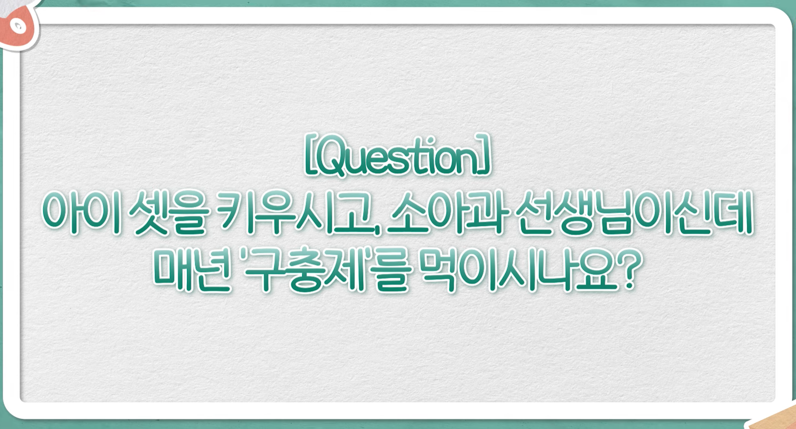 구충제 복용이 필수💥인 증상이 몇 가지 있어요. 먼저 아이들의 경우 항문을 가려워해요😥. 기생충이 항문 주변에 알을 낳기 때문이죠. 특히 밤에 잘 때 가려워하는 경우가 많답니다. 또 다른 경우는 기저귀를 착용하는 아이들의 경우 변을 살폈을 때, 실 같은 기생충이 움직이는 경우가 있어요😱. 이런 경우 기생충 감염이 100%라고 봐서, 사진이나 동영상으로 촬영하여 병원에 이야기하고 돌전의 아이라도 구충제 처방을 받아야 해요. 이럴 경우 아이가 사용하는 수건이나 옷, 침대 시트, 이불 등은 모두 뜨거운 물에 세탁🧼을 하고 건조를 잘 해주세요. 또한 손톱을 자주 깎아주고 개인위생을 철저하게 챙겨주시면 된답니다!
