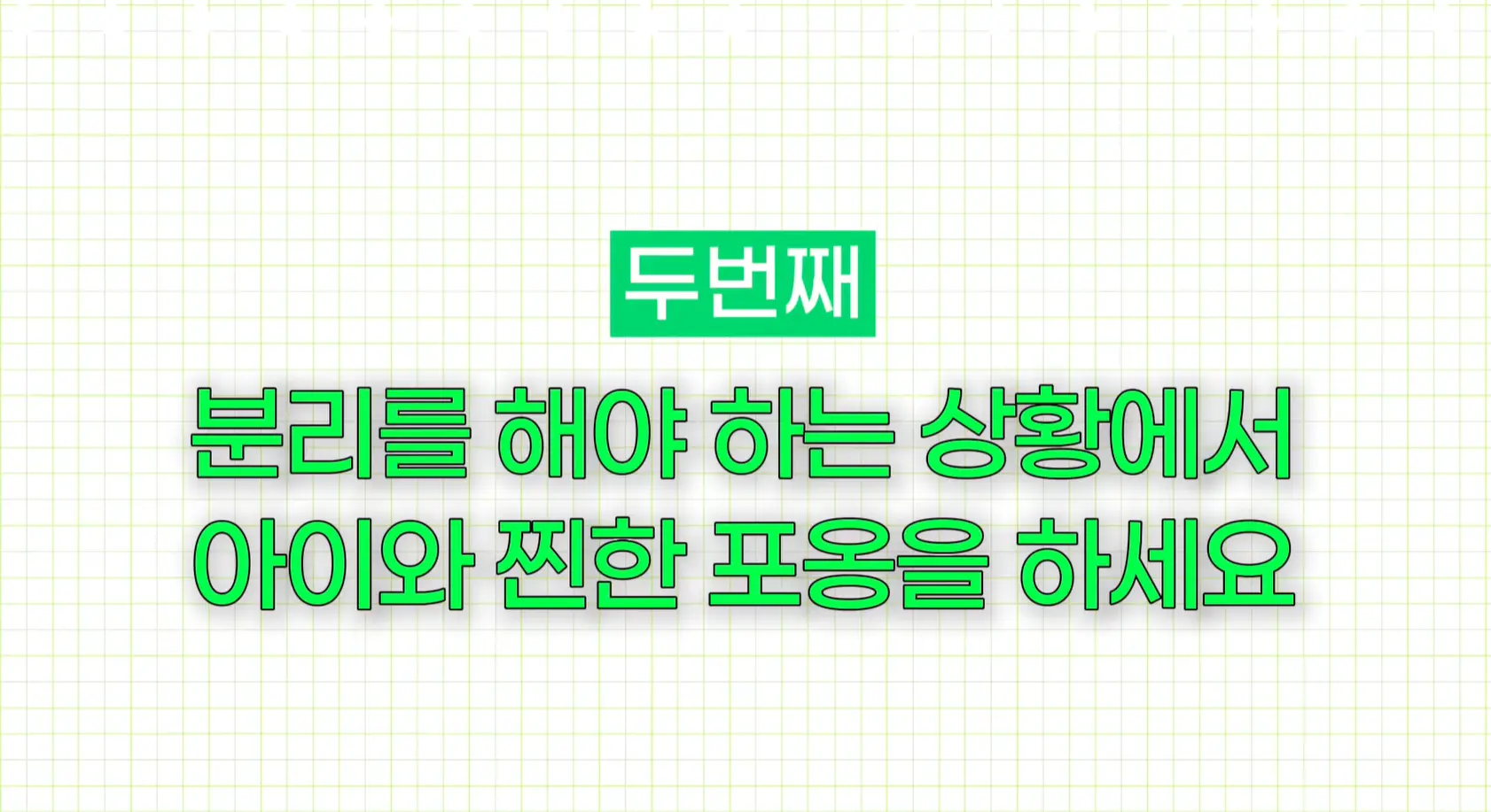 아이와 분리해야 할 때는 포옹하며 상황을 설명하고 애정의 말을 전해 주세요. 아이가 울더라도 차분하게 반응 해주세요. 꽉 안아줌으로써 엄마의 온기를 느끼고 안정감을 얻을 뿐 아니라 스스로 안전하다는 느낌을 얻는다고 해요.😌