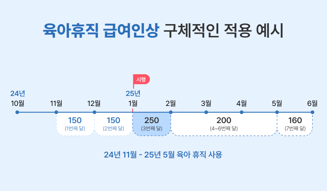 만약 다음 달 (24년 11월)부터 육아휴직에 들어간다고 하면, 11월과 12월은 기존대로 150만원을 받고, 25년 1월부터는 인상된 250만원이 지급된다고 해요.