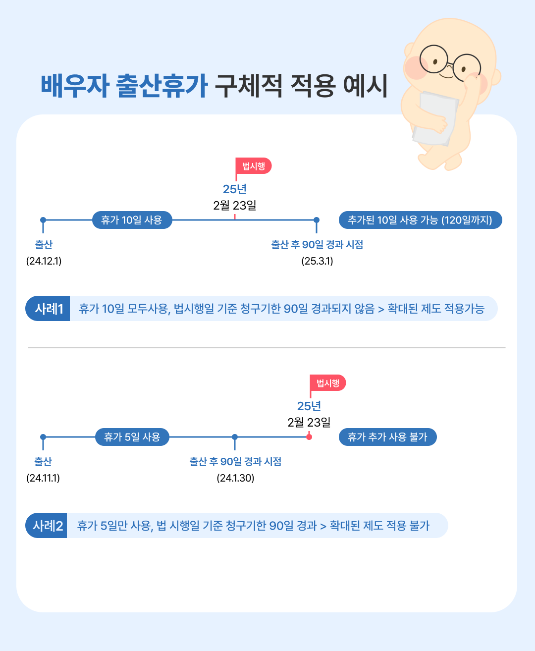 내년부터 출산휴가도 변경돼요. 출산 후 90일이 지나지 않았다면, 내년 2월 23일 기준으로 늘어난 출산휴가를 사용할 수 있답니다. 이는 부모에게 더 많은 시간을 제공해 주는 긍정적인 변화예요.