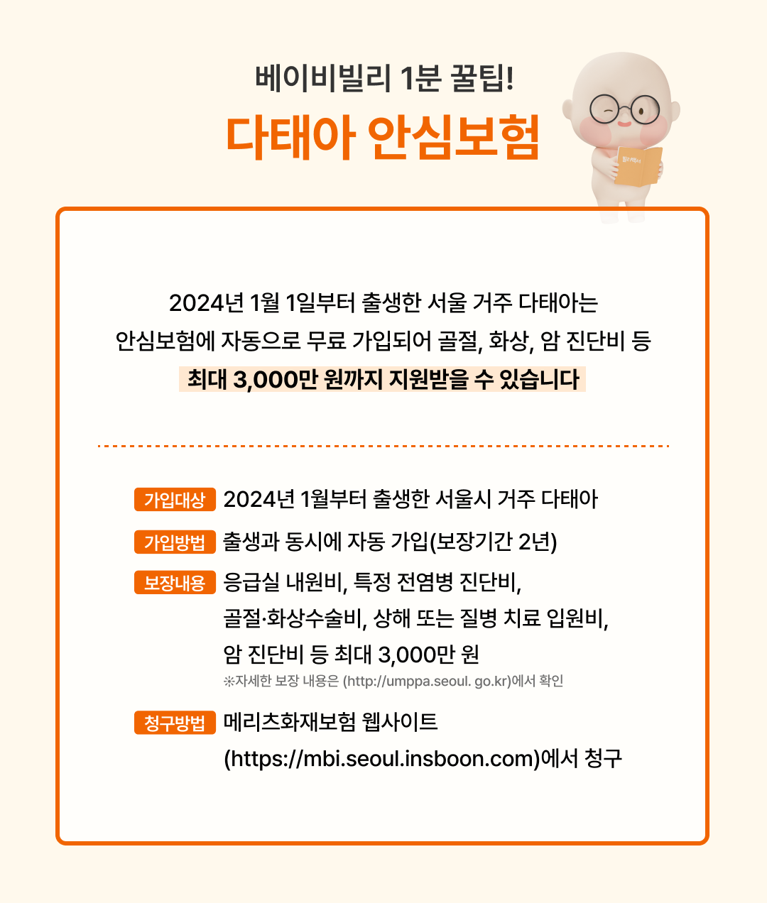 난임시술로 쌍둥이가 늘고 있는 추세를 고려해 서울시에서는, 다태아들을 위한 안심보험 서비스 복지를 시행하기로 하였어요. 2024년 1월 1일부터 서울에서 태어나는 쌍둥이는 ‘다태아 자녀안심보험’에 자동으로 가입돼요.👍🏻