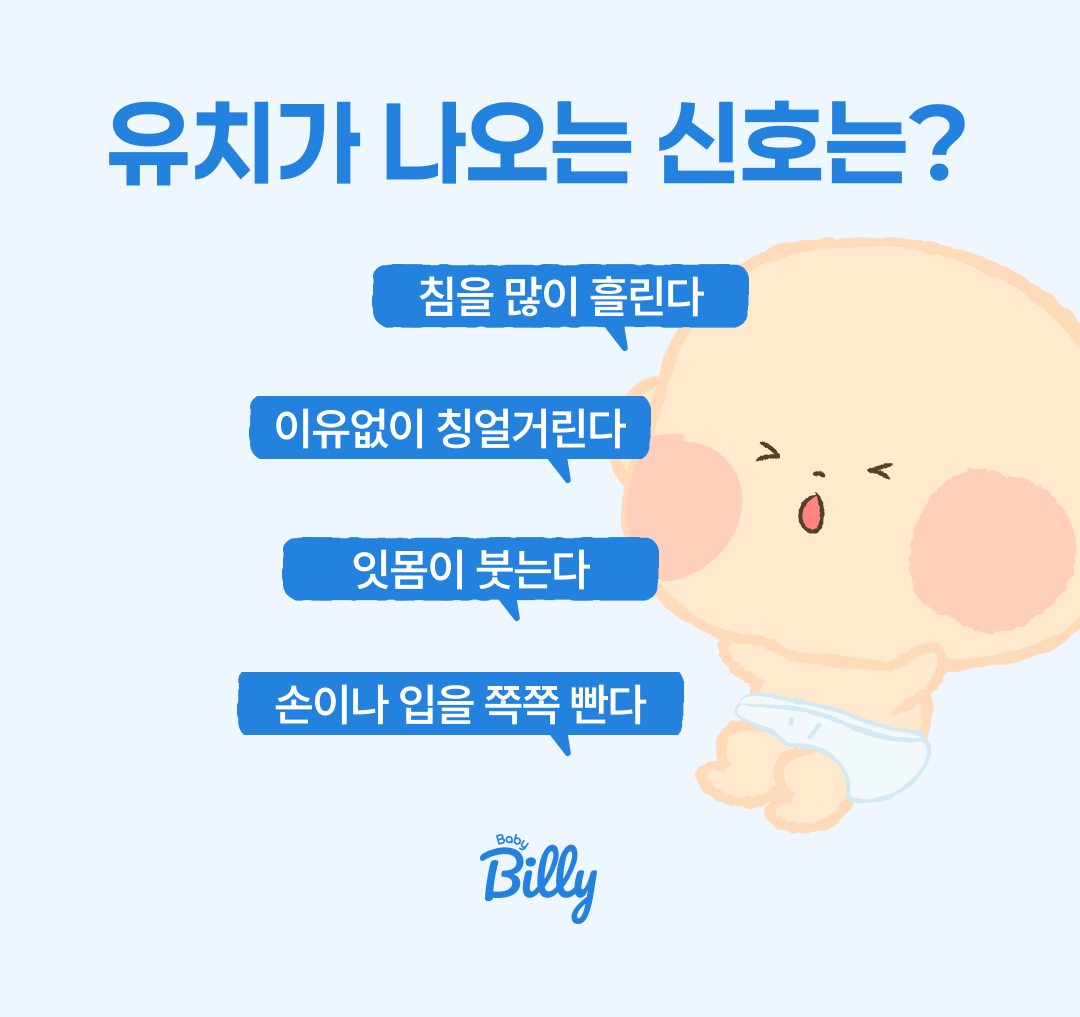 치아가 올라올 때는 불편함을 호소할 수 있어요. 😭이를 '이앓이'라고 부르죠. 대표적인 신호는 아래와 같습니다.