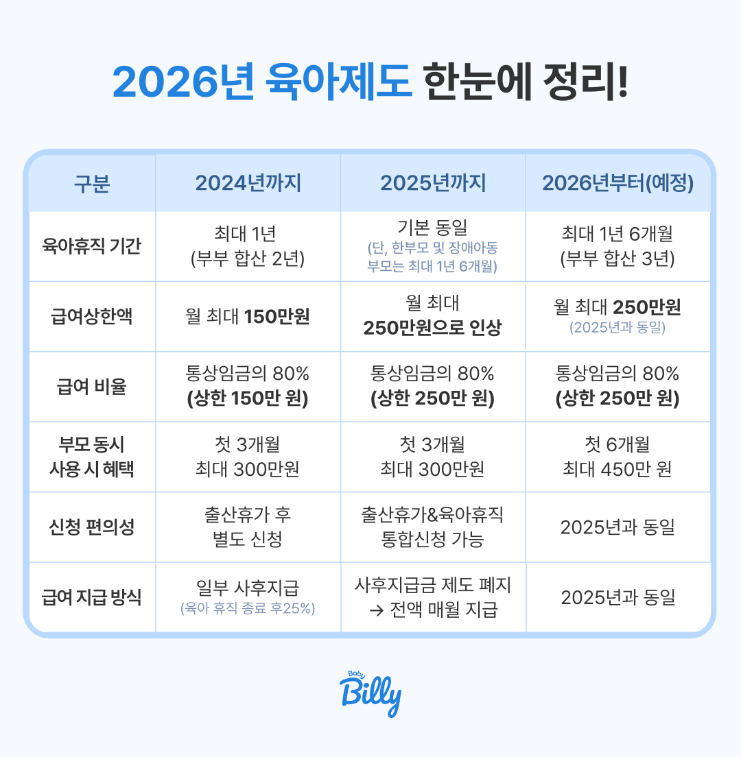 2026년, 부모의 하루가 조금 더 여유로워집니다. 😉올해부터 달라지는 육아정책은 부모의 부담 완화와 양립 지원에 초점을 맞췄어요. 육아휴직 기간이 길어지고, 급여도 더 넉넉해졌어요. 아동수당은 만 8세까지 확대되고, 아이돌봄 지원 기준도 완화되었죠. 이제 부모의 시간과 마음을 지켜주는 제도들이 더 든든해졌어요. 베이비빌리와 함께 2026년 달라진 육아정책을 하나씩 알아볼까요? 👶🏻