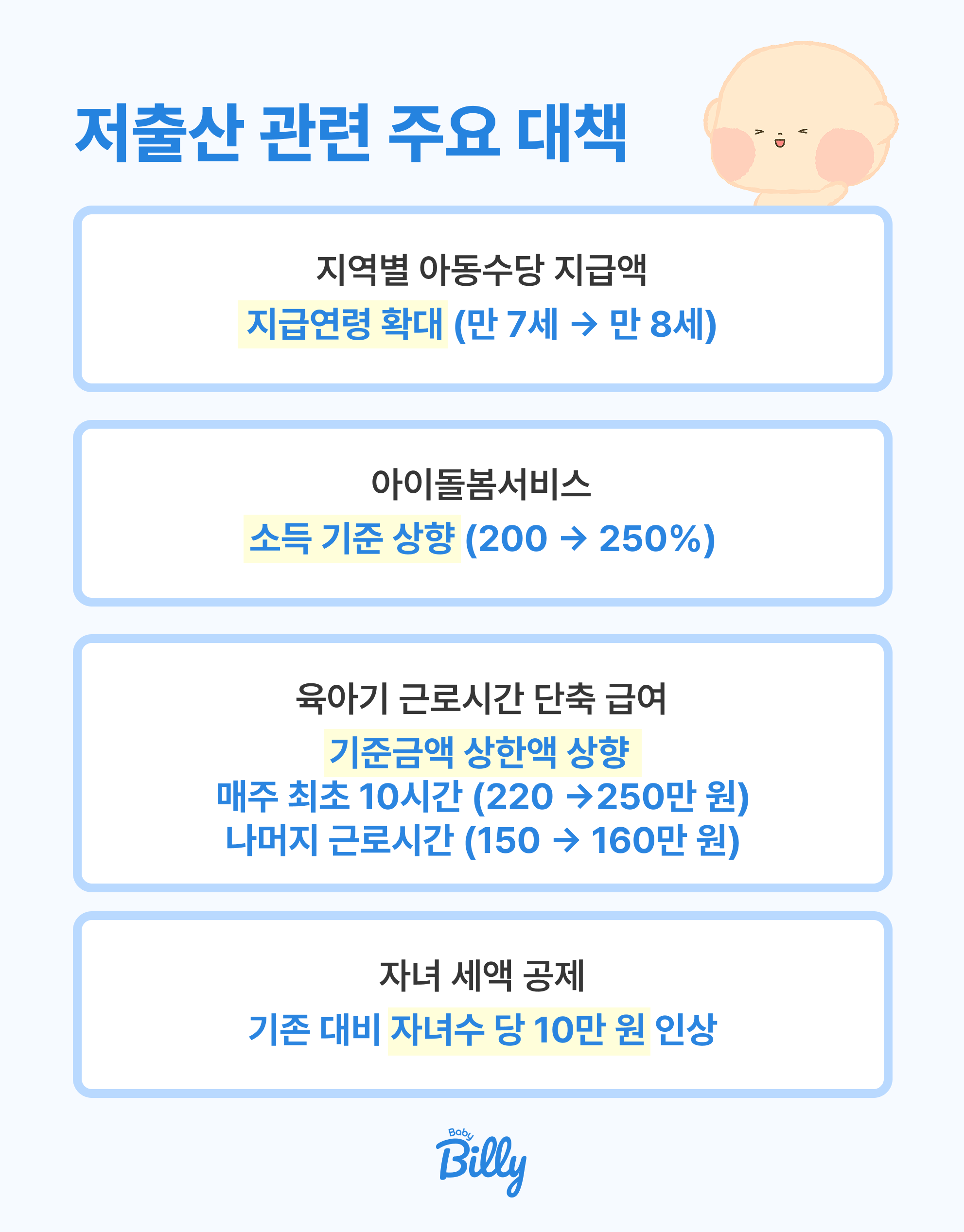 아이를 키우는 과정이 조금이라도 더 가벼워질 수 있도록 변화하는 정책들을 놓치지 말고 꼭 챙겨보세요. 베이비빌리는 모든 부모님이 불안 대신 기쁨으로 아이와 마주할 수 있는 세상을 언제나 응원할게요.💙
